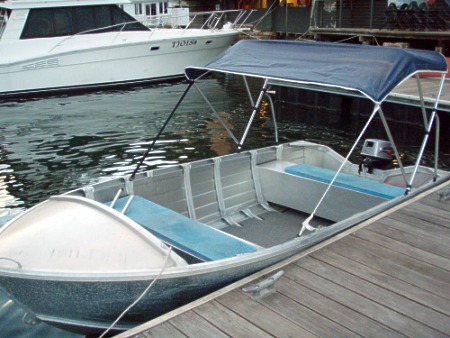Seats 8 people. Half hard top cover for shade. 8hp outboard motor.